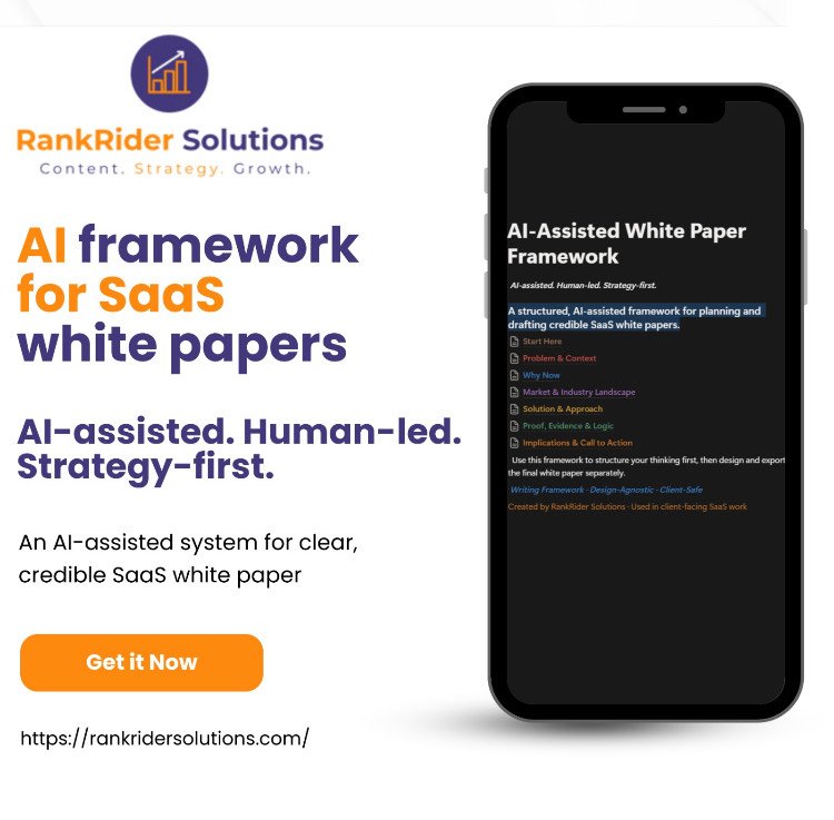 The AI-Assisted White Paper Framework is a strategy-first Notion system designed to help SaaS and B2B teams plan, draft, and refine high-credibility white papers — without turning them into sales brochures.